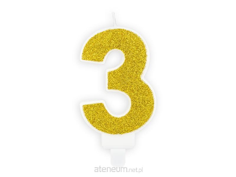 Świeczka urodzinowa Cyferka 3 w kolorze złotym brokatowym, rozmiar ok. 7 cm.
