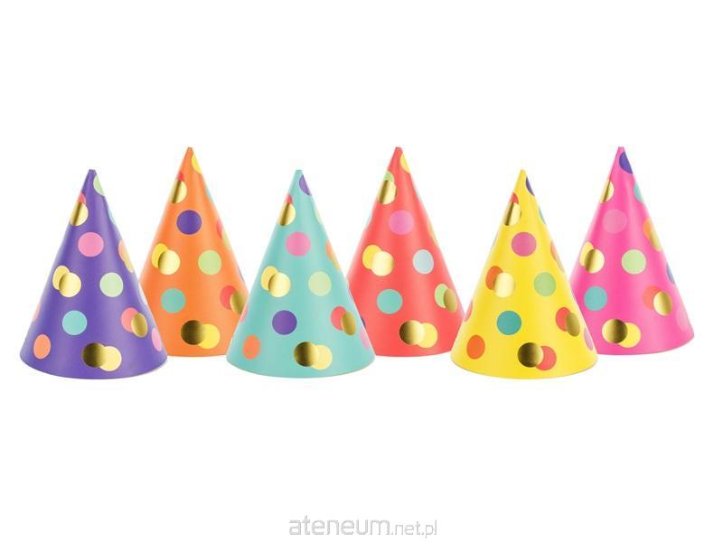 Czapeczki w 6 kolorach z kolorowymi i złotymi kropkami, wysokość ok. 16 cm, średnica ok. 11 cm.(1 op. / 6 szt.)