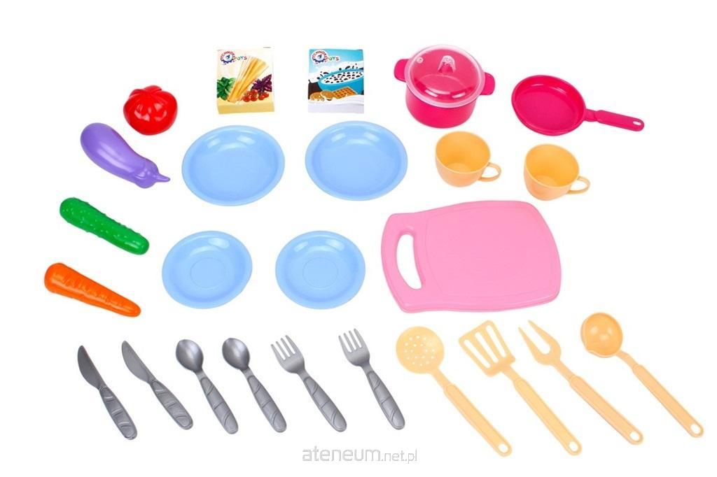 Kompletny zestaw: blat ze zlewem i kranem, deska kuchenna, patelnia z pokrywką, patelnia, łyżki 2 szt., widelce 2 szt., noże 2 szt., talerze 2 szt., duży do , skimmer, łopatka, gałka, ogórek, marchewka, bakłażan, pomidor, pudełka 2 szt.