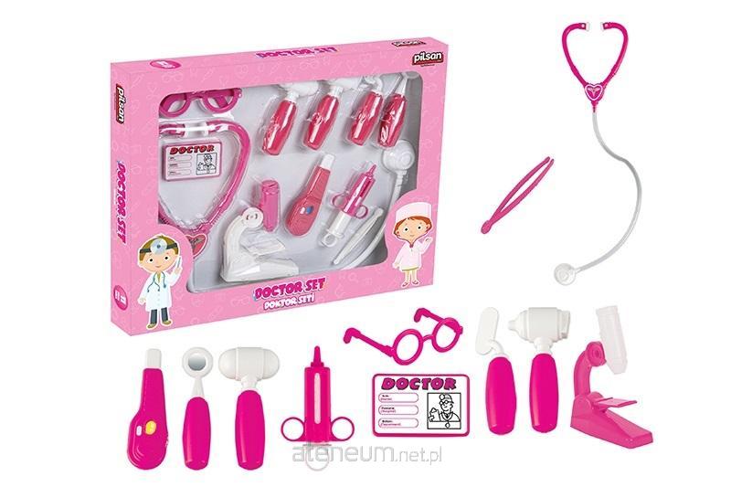 W zestawie: stetoskop, pęseta, strzykawka, młoteczek, termometr, mikroskop, okulary, akcesoria lekarskie, plakietka lekarza.