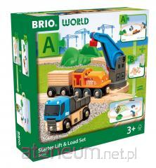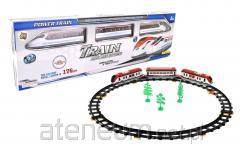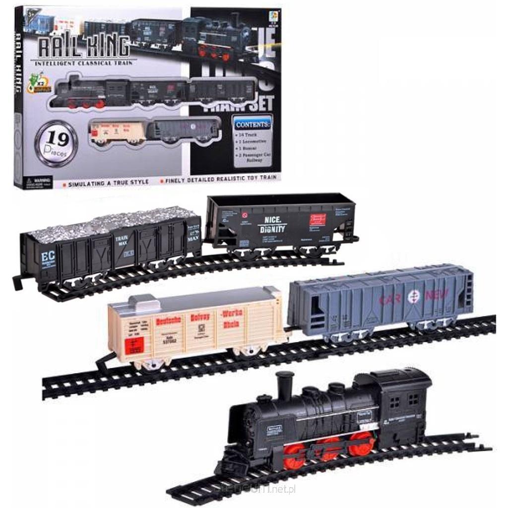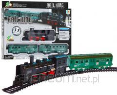 Lokomotywa na baterie z czterema wagonami i zestawem torów.