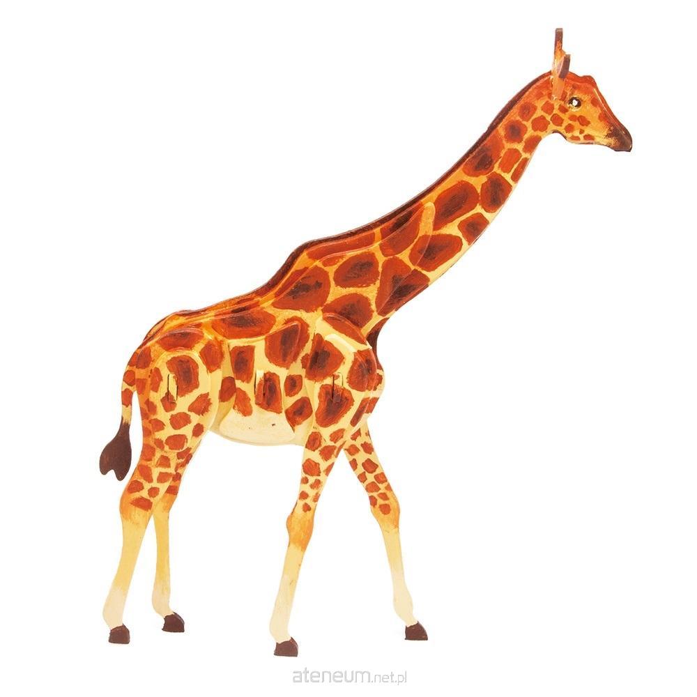Drewniane puzzle 3D w kształcie żyrafy, wykonane z wysokiej jakości sklejki. Opakowanie zawiera pędzelek oraz farby akrylowe, którymi można pomalować model po złożeniu. Zestawy mają postać arkuszy z wstępnie wyciętymi i ponumerowanymi elementami, które przed montażem należy oddzielić od wykroju, a następnie połączyć bez użycia kleju, zgodnie ze szczegółową instrukcją dołączoną do opakowania. Zabawka edukacyjna pobudzająca dziecięcą wyobraźnię i kreatywność.