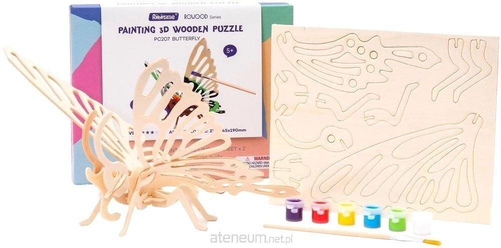 Drewniane puzzle 3D w kształcie motyla, wykonane z wysokiej jakości sklejki. Opakowanie zawiera pędzelek oraz farby akrylowe, którymi można pomalować model po złożeniu. Zestawy mają postać arkuszy z wstępnie wyciętymi i ponumerowanymi elementami, które przed montażem należy oddzielić od wykroju, a następnie połączyć bez użycia kleju, zgodnie ze szczegółową instrukcją dołączoną do opakowania. Zabawka edukacyjna pobudzająca dziecięcą wyobraźnię i kreatywność.