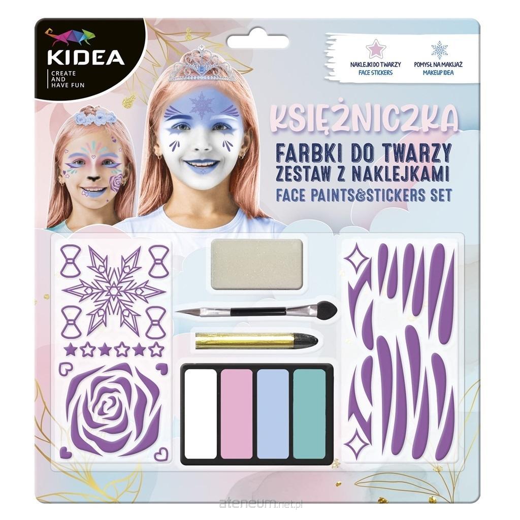 Stwórz makijaż godny prawdziwej księżniczki z farbkami i naklejkami do twarzy KIDEA! W zestawie Księżniczka znajdują się 4 pastelowe farbki, którymi bezpiecznie można malować po skórze, czarna kredka, gąbeczka, dwustronny aplikator oraz naklejki do ciała. Wypróbuj różne stylizacje, użyj naklejek i oczaruj wszystkich swoim bajkowym wyglądem!