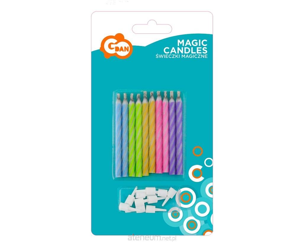 Świeczki magiczne pastelowe, 10/10 Magiczne świeczki, które po zdmuchnięciu zapalają się kilka razy. Opakowanie zawiera 10 kolorowych świeczek. 5 kolorów w opakowaniu: niebieski*2, zielony*2, żółty*2, różowy*2, fioletowy*2. Opakowanie zawiera również podstawki na każdą świeczkę. UWAGA - Ze względu na fakt, iż świeczki nasączone są płynem powodującym kolejny zapłon mają lekko szarawy odcień.