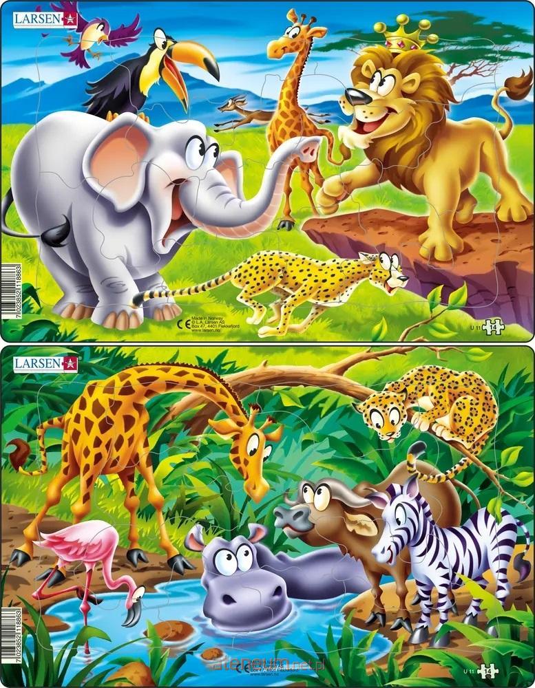 Średniej wielkości układanki, każda z 14 elementami. Wycinane w specjalny sposób dla najlepszej zabawy. Elementy układanek mają kształty pasujące do tematu obrazka. Dostępne są dwie układanki (wysyłane losowo).