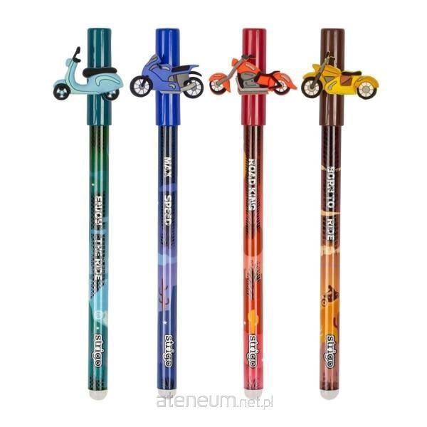 Wymazywalny długopis STRIGO ze skuwką z serii Motocykle. Średnica końcówki piszącej 0,5 mm. W display'u 36 sztuk po 9 sztuk ze wzoru.