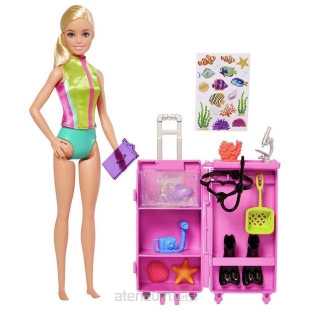 Barbie Kariera Biolożka morska zestaw z lalką oraz wieloma akcesoriami i naklejkami.