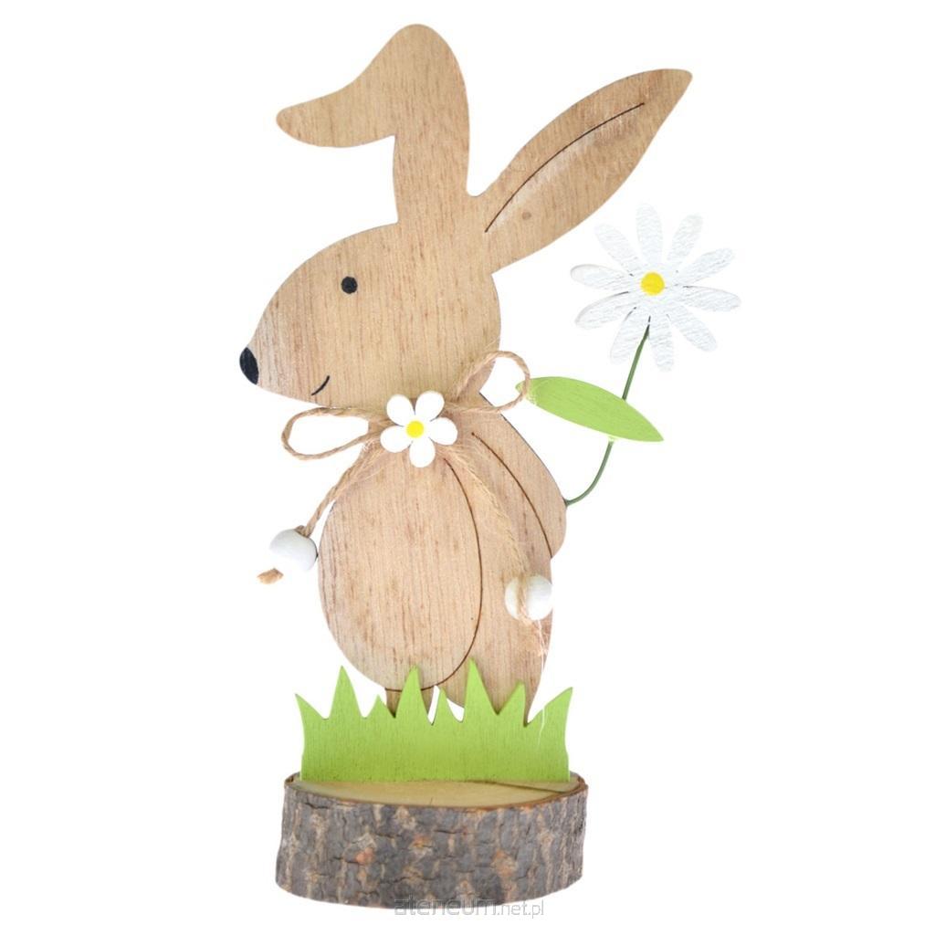 Drewniany zajączek na pniu. W pastelowych, wiosennych kolorach. Dostępny w różnych wzorach wysyłanych losowo. Wysokość produktu 17 cm.