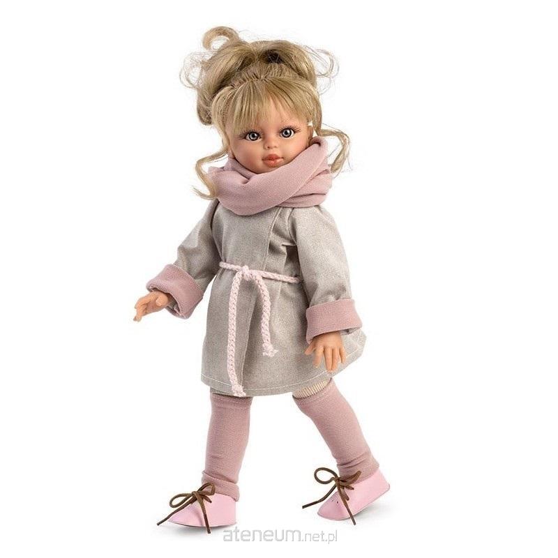 Lalka ma na sobie elegancki, szary płaszczyk wiązany w pasie. Dekorację okrycia stanowią różowe mankiety przy rękawkach. Strój uzupełnia różowy komin wykonany z dzianiny, beżowe rajstopki oraz różowe ocieplacze. Ponadto nóżki dziewczynki zdobią wiązane buciki w kolorze różowym. Wszystkie ubrania dziewczynki można zdjąć, aby umilić zabawę i nabrać wprawy w przebieraniu pociechy. Ubranko uszyto z przyjemnych w dotyku tkanin by zapewnić dziecku komfort zabawy.