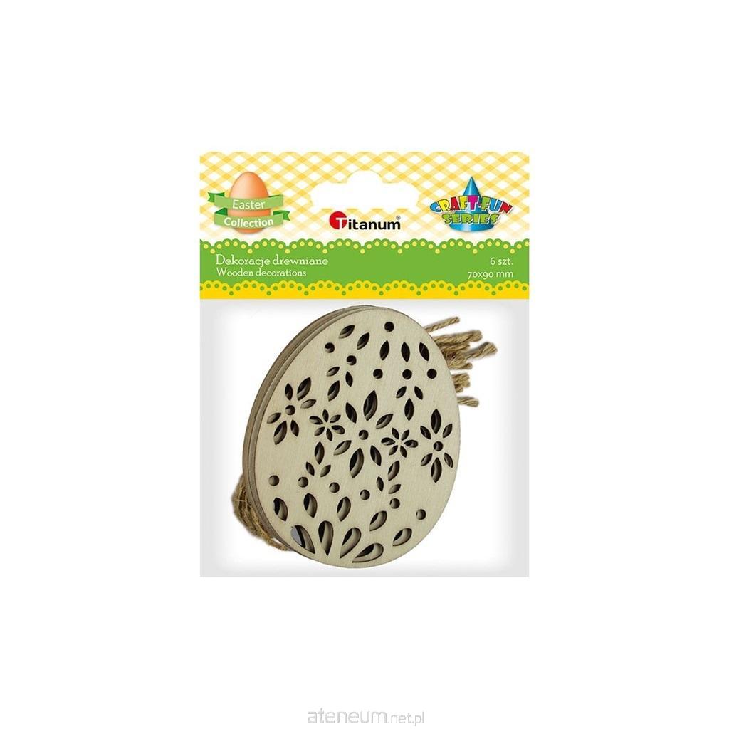 Zawieszki drewniane, wzór: pisanki ażurowe, wymiary: 70 x 90 mm, jutowy sznureczek. 6 sztuk.