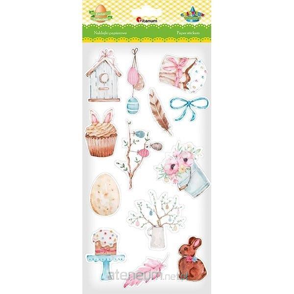 Naklejki papierowe: dekoracje wielkanocne, muffiny, piórka, królik z czekolady, 13 szt.
