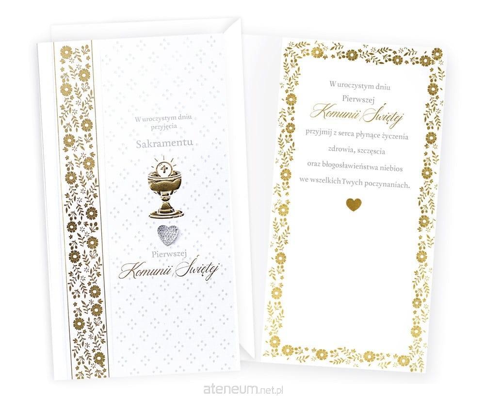 Każda kartka w kolekcji Passion Moments to małe arcydzieło - wyjątkowe i niepowtarzalne, piękne wizualnie. Kartki PM są bardzo bogato zdobione, a jednocześnie skromne i stylowe, cały efekt tkwi w detalach i doskonałym wykonaniu. W zależności od wzoru, na kartkach znajdują się dekoracje ze złotej, srebrnej, perłowej lub holograficznej folii, a także doklejki biżuteryjne, kokardki, brokat, laserowe wycięcia, wstążeczki i inne dodatki. Wnętrze karnetu to zawsze atrakcyjna grafika i tekst życzeń. Kartki mają w komplecie dopasowaną kopertę. Cechy szczególne: zdobienie: przynajmniej dwie folie (metaliczne/perłowe/holograficzne), brokat, elementy doklejane, wycięcia laserowe, wstążeczki - w zależności od wzoru, wnętrze: z delikatną grafiką, wyjątkowe życzenia w środku, w komplecie: dopasowana kolorystycznie koperta, okazja: komunia Wymiary karnetu po złożeniu: 11,4 x 21,5 cm.