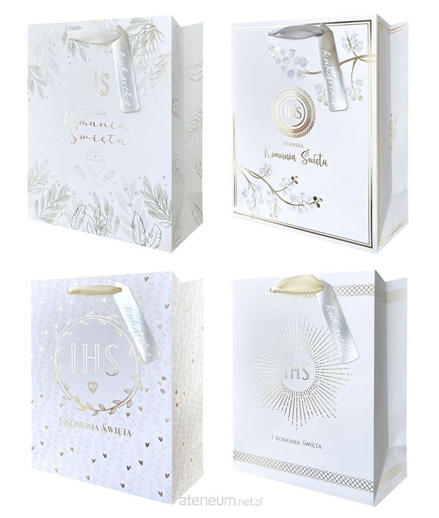 Torby z serii QP, oprócz świetnej jakości serii Q, wyróżniają się posiadaniem dodatkowego elementu dekoracyjnego - np.. doklejanej kokardki lub odstawnika, grubszego brokatu, złoconej zawieszki itp.. W takiej torbie każdy prezent zyskuje na prestiżu. Cechy szczególne: typ produktu: torba na prezent, zdobienie: metaliczna folia, wielkość orientacyjna: 18 x 10 x 23 cm(szerokość x głębokość x wysokość), okazja: Komunia.