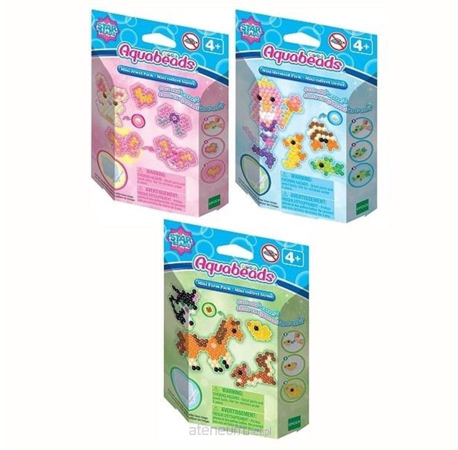 Dzięki mini zestawom można tworzyć wspaniałe motywy Aquabeads. Dostępne są mini zestawy Aquabeads o tematyce dotyczącej wiejskiej zagrody, biżuterii czy syren. Zestaw zawiera wszystko, co jest potrzebne, aby od razu rozpocząć zabawę: 180 kolorowe koraliki, podkładkę do układania, spryskiwacz i zestaw arkuszy z szablonami. Koraliki łączą się w magiczny sposób podobnie jak koraliki do prasowania. Różnica: Zabawa odbywa się bez użycia żelazka, koraliki łączy się przez spryskanie ich wodą. Produkt przeznaczony dla dzieci od 4 roku życia.