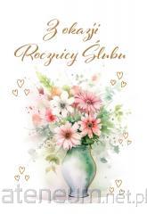 Kartka w powiększonym tzw. Angielskim formacie 140x190 mm. Wykonana z niezwykłą dbałością o szczegóły, zdobiona metalizowaną folią. W środku kartki znajduje się krótki tekst z życzeniami, a pod spodem jest miejsce na własną dedykację. w komplecie: dopasowana kolorystycznie koperta. okazja: Rocznica ślubu