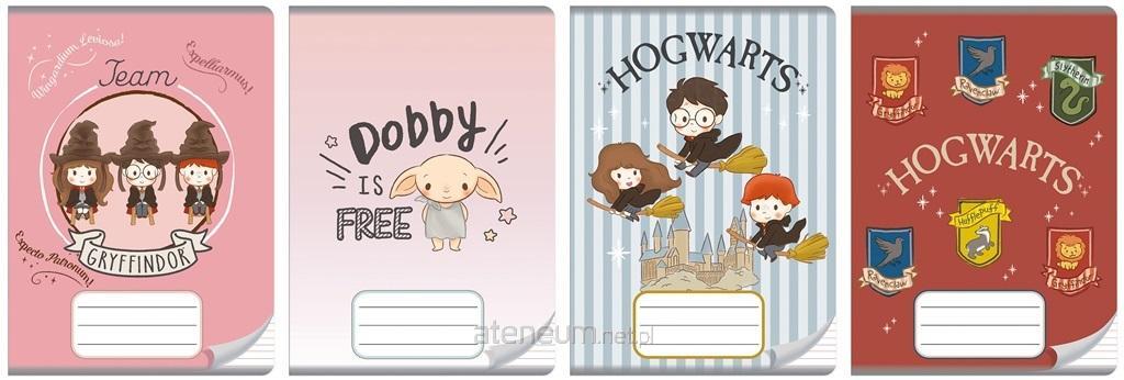 Zeszyt A5, posiada 16 kartek o gramaturze 70 g/m2 w 3 kolorowe linie. Charakteryzuje się estetycznym, lakierowanym wykończeniem i okładką z serii Harry Potter. Na zewnętrznej stronie okładki: imiennik - miejsce na wpisanie imienia, nazwiska, klasy.
