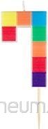 Świeczka urodzinowa w kształcie cyfry 7 z motywem kolorowych klocków. Idealna jako dopełnienie dekoracji tortu. Posiada element umożliwiający stabilne wbicie świeczki w ciasto. Wysokość świeczki to 7 cm.