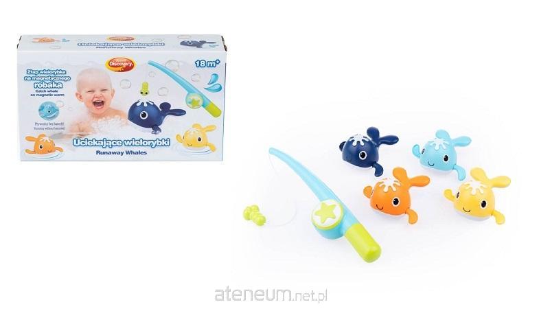 4 uciekające wielorybki, a każdy z nich szybki i uroczy! Po nakręceniu wielorybków pokrętłem znajdującym się na ich brzuszkach i umieszczeniu ich w wodzie, popłyną do przodu, sprawnie wiosłując płetwami. Każdy z nich posiada na głowie magnes, co pozwala złapać je na wędkę, za pomocą magnetycznego robaka! Wędka wyposażona została w ruchomy kołowrotek, który opuszcza i podciąga na lince robaczka. Ten umilacz dziecięcych kąpieli jest nie tylko śliczny, ale też ekonomiczny w użytkowaniu, gdyż kolorowa ferajna wielorybków pływa bez baterii.