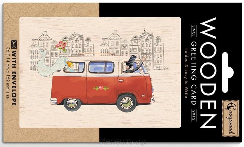 Drewniany karnet w formacie C6 z kopertą. W środku nie zawiera tekstu. Ten karnet jest w 100% biodegradowalny, wykonany przy użyciu minimalnego nakładu energii, gazu i wody. Jego wytworzenie zużywa 5 razy mniej drewna niż wykonanie karnetu papierowego. Wyprodukowany na Litwie.