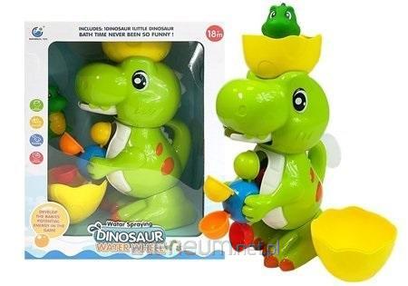 Kąpielowy Dinozaur Młynek Tryskający Wodą Wesoła zabawka przeznaczona jest do zabawy podczas kąpieli w wannie i baseniku. Zielony dinozaur będzie również rewelacyjnym rozwiązaniem dla rodziców, których pociecha boi się i wzbrania przed kąpielą - prezentowana przez nas zabawka z pewnością sprawi, że maluszek w przyjemny sposób oswoi się z wodą. W zestawie znajduje się: - dinozaur - malutki dinozaur gumowy - kubeczek w kształcie połówki jajka do nabierania wody. Zielony dinozaur posiada też swoje maleństwo, którym twoja pociecha może także bawić się w wodzie.Wielokolorowy kołowrotek sprawia, że każda kąpiel będzie wielką frajdą dla dziecka. Należy nabrać wodę, a następnie wlać ją do połówki skorupki jaja na umieszczonego na głowie dinozaura. Woda wypłynie przez paszcze dinozaua, a następnie spłynie w dół przez kolorowe kołowrotki, wprawiając je w ruch. To będzie niespotykane doświadczenie dla Twojego dziecka. Wysokość dinozaura: 22 cm Wymiary opakowania : 28cm x 22cm x 11cm Produkt jest przeznaczony dla dzieci powyżej 18 mc życia. Zabawka jest zgodna z normą EN71.