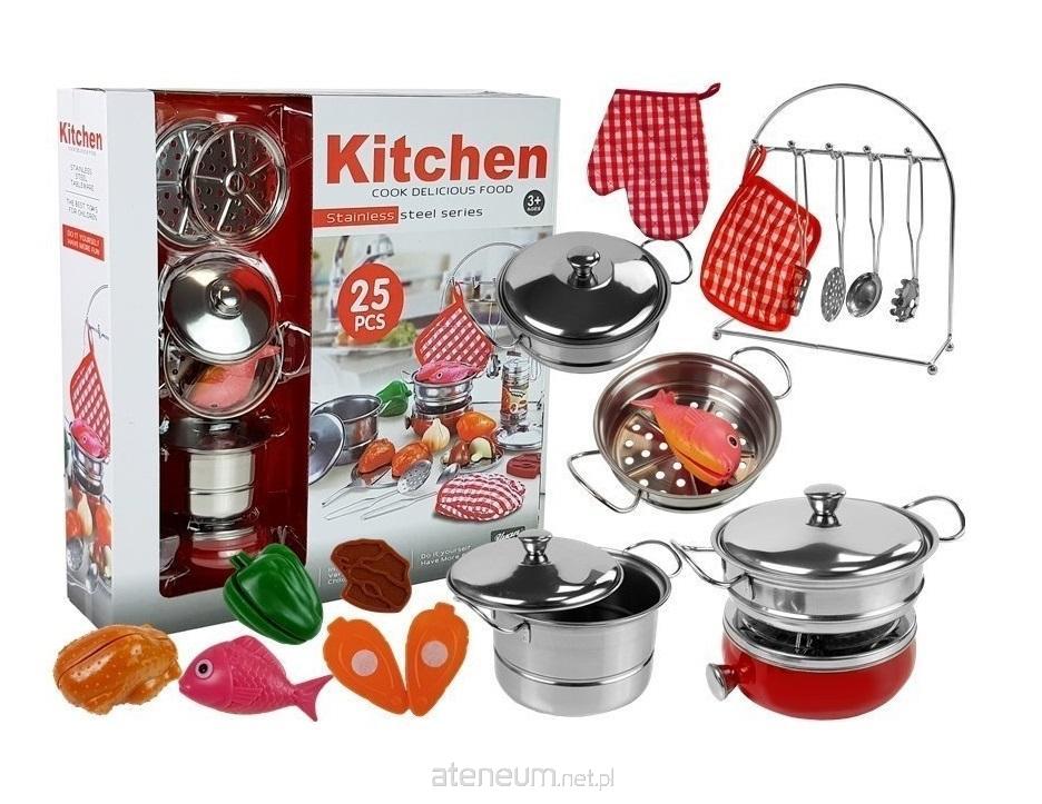 Zestaw Naczyń Garnków Mały Kucharz Stal Nierdzewna Zabawa z dom jest jedną z najpopularniejszych rozrywek zauważalnych wśród dzieci. Tworzą przeróżne, oryginalne scenariusze, dzieci mogą wcielać się w wybrane przez siebie role, do czego potrzebują przeróżnych akcesoriów ułatwiających zabawę. Rozwijają swoją kreatywności i zdolności manualne poprzez zabawę. Zestaw garnków będzie przydatny dla każdego małego master szefa. Rozwinie jego zainteresowania gotowaniem, dzięki czemu rozwinie swoje zainteresowania. Garnki i sztućce maja kolor metaliczny, który będzie pasował do każdej kuchni. Elementy zestawu: - patelnia - garnki z różnej wielkości durszlakami - stojak na narzędzia kuchenne - materiałowa podkładka pod naczynia - materiałowa rękawica - warzywa: marchewka, grzyb, papryka, cebula, ryba, stek, kurczak, przyprawy - trzepaczka - łyżka wazowa - łopatka - cedzak - łyżka do makaronu - przykrywka Wszystkie elementy wykonane są z wysokiej jakości materiału dzięki czemu wyglądają dokładnie jak ich pełnowymiarowe odpowiedniki. Artykuły spożywcze sprawdzą się idealnie do gotowania, pieczenia, smażenia. Wymiary opakowania: 40 cm x 11 cm x 41 cm Zestaw przeznaczony jest dla dzieci powyżej 3. roku życia. Zabawki posiadają certyfikat CE i są zgodne z normą EN 71. Zapakowane są w kartonik z przezroczystą witrynką, dzięki czemu nadają się idealnie na prezent.