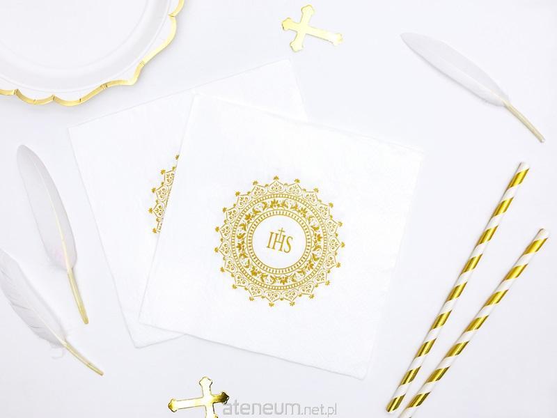 "Serwetki komunijne papierowe białe ze złotym nadrukiem IHS, wymiary po rozłożeniu ok. 33 x 33 cm, wymiary po złożeniu ok. 16,5 x 16,5 cm. (1 op. / 20 szt.)"