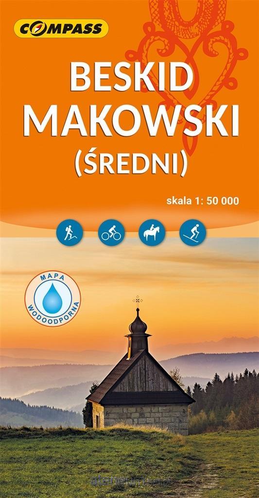 Beskid Makowski w wersji laminowanej to mapa jednostronna w skali 1:50 000. Przedstawia cały obszar Beskidu Makowskiego (zwanego też Beskidem Średnim lub Myślenickim) oraz fragmenty Beskidów: Małego, Wyspowego i Żywieckiego. Swym zasięgiem obejmuje tereny od Wadowic na zachodzie po Dobczyce i Rabkę-Zdrój na wschodzie. Beskid Makowski składa się z wielu rozczłonkowanych pasm górskich i wzniesień pomiędzy którymi wyrzeźbione zostały doliny górskie. Najwyższym szczytem jest Mędralowa - 1169 m n.p.m. (według regionalizacji fizycznogeograficznej Jerzego Kondrackiego). Pozostałe pasma osiągają wysokość do 700 - 800 m n.p.m. Jest to obszar dość gęsto zaludniony. Lasy występują jedynie w wyższych partiach. Jest to atrakcyjny, choć mało popularny teren na piesze i rowerowe wycieczki. Do największych ośrodków turystyki górskiej na tym obszarze należą Sucha Beskidzka i Maków Podhalański. Region ten wyróżnia się pod względem etnograficznym. Zamieszkują go różne grupy etnograficzne, czego odzwierciedleniem jest m.in. folklor i zabudowa wsi. Na mapie zastosowano cieniowanie w celu uzyskania wrażenia plastyczności rzeźby terenu. Zaznaczono również obszary "Zanocuj w lesie". Na rewersie mapy znajdują się: obszerne opisy o przedstawionym terenie, informator krajoznawczy, barwne fotografie, plan centrum Myślenic, mapka Dróżek Kalwaryjskich oraz wybrana baza noclegowa. Mapa polecana jest do uprawiania różnych form turystyki, jak również dla osób zmotoryzowanych.