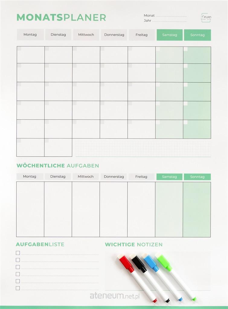 PLANER MIESIĘCZNY MAGNETYCZNY W JĘZYKU NIEMIECKIM - zielony Marka: Plan Your Life Wymiary: 60 x 45 cm Planer wyposażony jest w magnetyczny podkład, dzięki czemu można go ulokować na lodówce jak i każdej innej powierzchni metalowej. Planer ten znacznie ułatwi zaplanowanie obowiązków i najważniejszych wydarzeń nadchodzącego miesiąca, nadaję się zarówno do domu, szkoły czy biura. Mocny magnes i warstwowa budowa Silny magnes powoduje, że planer się nie zsuwa i nie przemieszcza podczas pisania. Wytrzymała powierzchnia z nanomateriałów ułatwiająca ścieranie - sprawi, że planer będzie Ci długo służył nawet podczas bardzo intensywnego użytkowania! Do każdego planera 4 markery GRATIS.