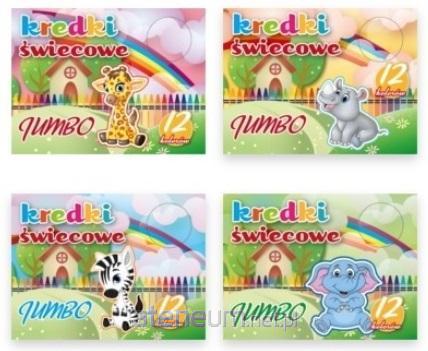 Kredki świecowe 12 kolorów: pomarańczowy, brązowy, granatowy, fioletowy, niebieski, jasny zielony, jasny brąz, czarny, ciemny fioletowy, ciemny zielony, czerwony, żółty.