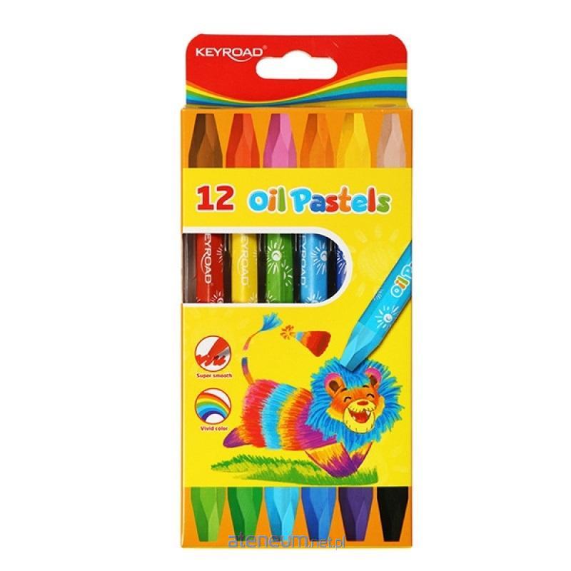 W zestawie 12 sztuk miękkich pasteli olejnych z sześciokątnymi końcówkami w różnych kolorach.