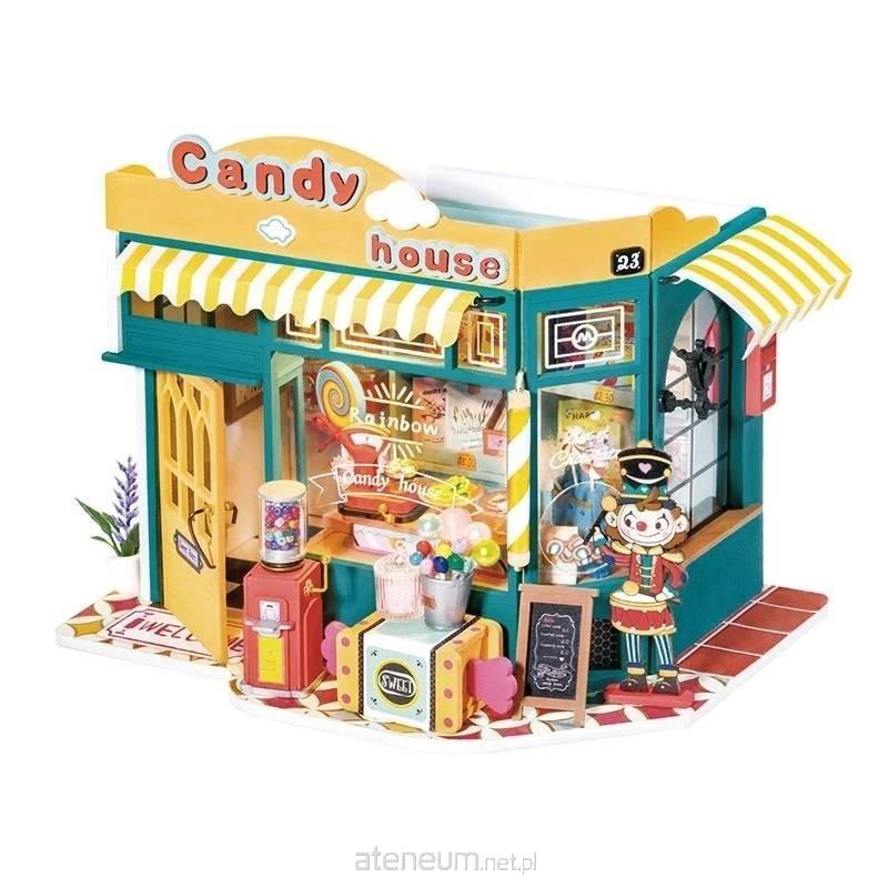 Zestaw umożliwiający złożenie miniaturowego sklepiku ze słodyczami z oświetleniem LED. Do budowy modelu wykorzystano między innymi drewno, papier, tkaniny, drut, tworzywo sztuczne oraz różne elementy dekoracyjne takie jak: kolorowe ozdoby, cekiny, koraliki, sztuczne kwiaty oraz wiele innych materiałów. Dodatkowego uroku nadaje całości oświetlenie LED, dzięki któremu pracownia może pełnić rolę nastrojowej dekoracji lub lampki nocnej. Opakowanie oprócz czytelnej, obrazkowej instrukcji zawiera także baterie, pędzelek, farby akrylowe, przezroczysty, bezwonny klej oraz pęsetę ułatwiającą montaż małych elementów. Budowa tego modelu pomoże rozwinąć zdolności manualne i przyniesie dużo satysfakcji.