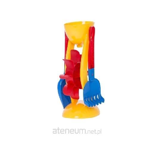 Młynek, który w zestawie zawiera łopatkę i grabki, może służyć zarówno do przesypywania piasku na plaży, jak i do przelewania wody podczas zabawy w kąpieli.