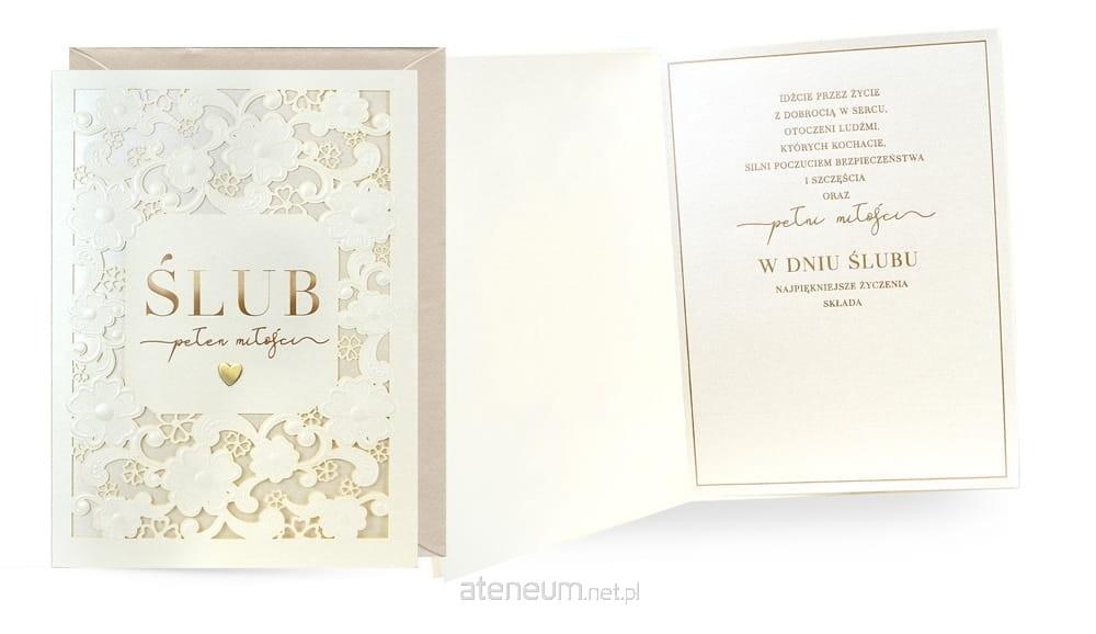 Karnet Dream Cards Plus "Ślub" w powiększonym tzw. Angielskim formacie 140x190 mm. Kartka z ozdobnej serii Dream Cards Plus robi wrażenie dzięki atrakcyjnej kolorystyce i ciekawym zdobieniom. To idealny wybór łączący przyjazną cenę z jakością. Cechy szczególne: wielkość: 14,5 x 19,5 cm po złożeniu kopertą, wnętrze: wyjątkowe życzenia w środku, w komplecie: dopasowana kolorystycznie koperta. zdobienia: różnorodne, bogate (w zależności od wzoru: przyklejane dekoracje, elementy biżuteryjne, odstawniki, brokat, metaliczne folie, tłoczenia itp.), okazja: ślub