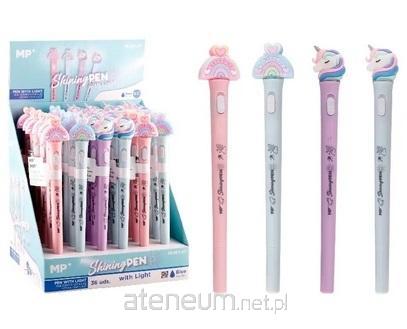 Świecący długopis niebieski 0,7mm. Opakowanie zbiorcze zawiera 36 sztuk. Mix wzorów.