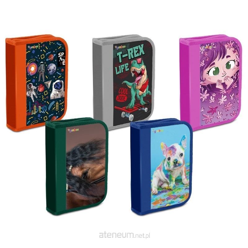 Piórnik szkolny, nadruk z jednej strony, z wyposażeniem GIMBOO. Materiał PVC, zamek błyskawiczny. Posiada jedną komorę i jedną przekładkę z dodatkową kieszonką. Kolor: mix kolorów, wzorów.