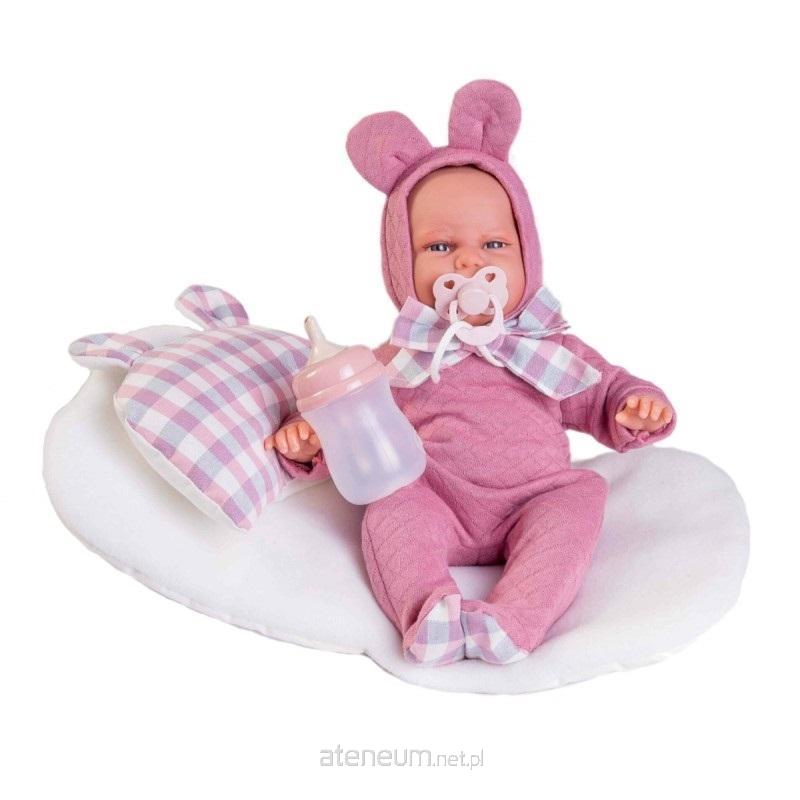 Lalka jest ubrana w fuksjową, pikowaną piżamkę z kapturem zakończonym uszkami. Dodając odrobinę elegancji do ubranka dziewczynki przyszyto kolorową kraciastą kokardę. Kiedy jest zmęczona kładzie się na łóżku, aby napić się z butelki na swojej ślicznej, kraciastej poduszce i ciepłej polarowej kołderce. Cudownie ubrana i zaprojektowana lalka z pewnością może służyć do odgrywania roli dziecka. Wszystkie elementy kompletu można zdjąć, dzięki czemu nasza pociecha nabiera wprawy w przebieraniu i uczy się codziennych czynności, które będą towarzyszyć w przyszłym życiu.