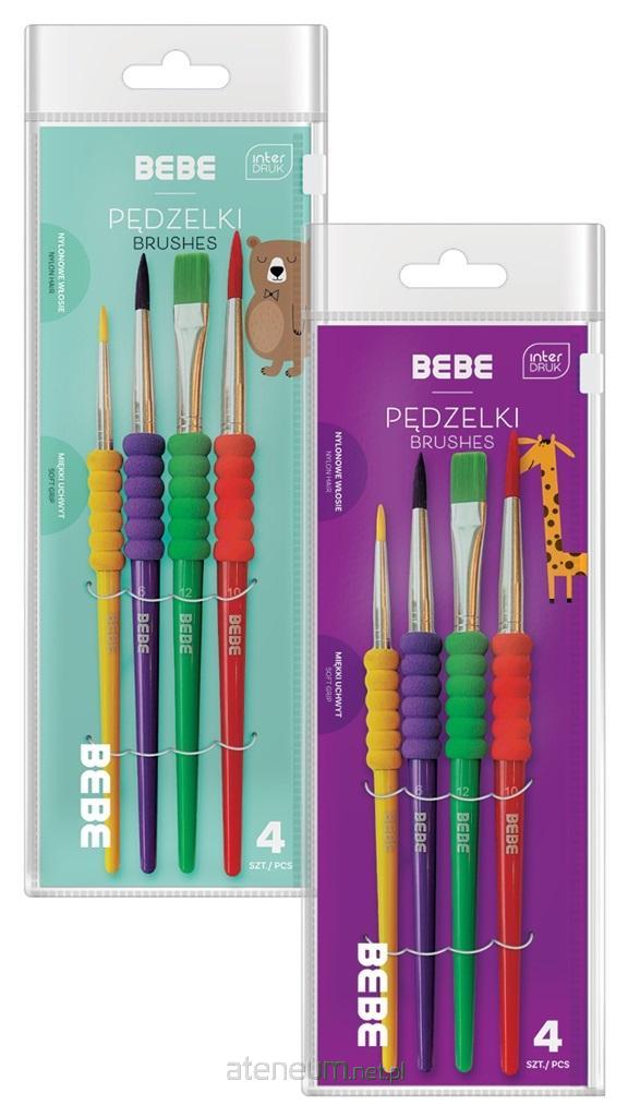 Zestaw 4 plastikowych pędzelków o różnych szerokościach i kształtach końcówek. Praktyczne etui z zamknięciem strunowym. Nylonowe włosie. Uchwyt pędzelków z miękkiej gąbki ułatwiający trzymanie.