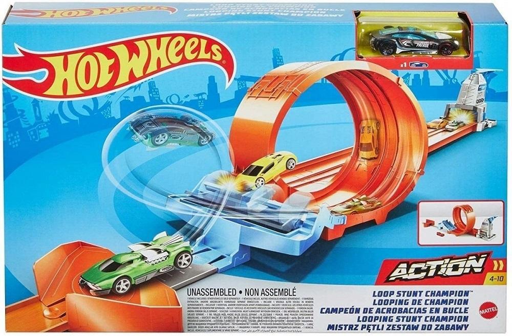 Zestaw Hot Wheels® Mistrz pętli zapewania niesamowitą kaskaderską i rajdową zabawę z podwójną wyrzutnią, pętlą na dwa samochodziki, rampą i miejscem do lądowania, które można dostosować. Eksperymentuj z siłą i techniką uderzenia, posyłając pojazdy Hot Wheels® przez pętlę i patrząc, jak wykonują epicki skok przed lądowaniem. Świetne wyzwanie na jeden lub więcej pojazdów (sprzedawane oddzielnie). Wyrzutnia może również wysyłać samochody na pętlę bokiem, aby zrobiły przewrotkę w powietrzu. Zestaw zawiera jeden samochodzik Hot Wheels® w skali 1:64 i zapewnia wyjątkową zabawę dzieciom w wieku od 4 do 6 lat. Kolory i elementy dekoracyjne mogą się różnić.