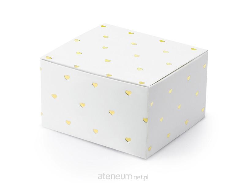 Pudełeczka w kolorze białym z metalizowanym sercami w kolorze złotym, wymiary po złożeniu ok. 6 x 3,5 x 5,5 cm.(1 op. / 10 szt.)