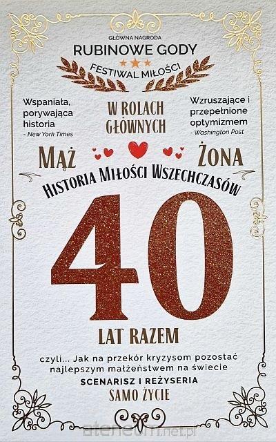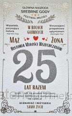 Karnet 5k w formie plakatu to wyjątkowy pomysł na sprawienie parze obchodzącej rocznicą związku, wesołej i niebanalnej niespodzianki. Wykonane z wysokiej jakości grubego papieru o gramaturze 350g i uszlachetnione złoceniem oraz tłoczeniem i brokatem. Oryginalne i wesołe teksty zaskoczą obdarowanych i z pewnością wywołają uśmiech na ich twarzach. Karnet może być idealnym dodatkiem do każdego prezentu. Karnet zawiera również humorystyczne życzenia.
