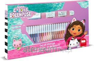 Pieczątki na licencji Koci Domek Gabi. W skład zestawu wchodzą: 3 drewniano-gumowe pieczątki, 1 poduszeczka do tuszu, 36 pisaków oraz książeczka z aktywnościami.