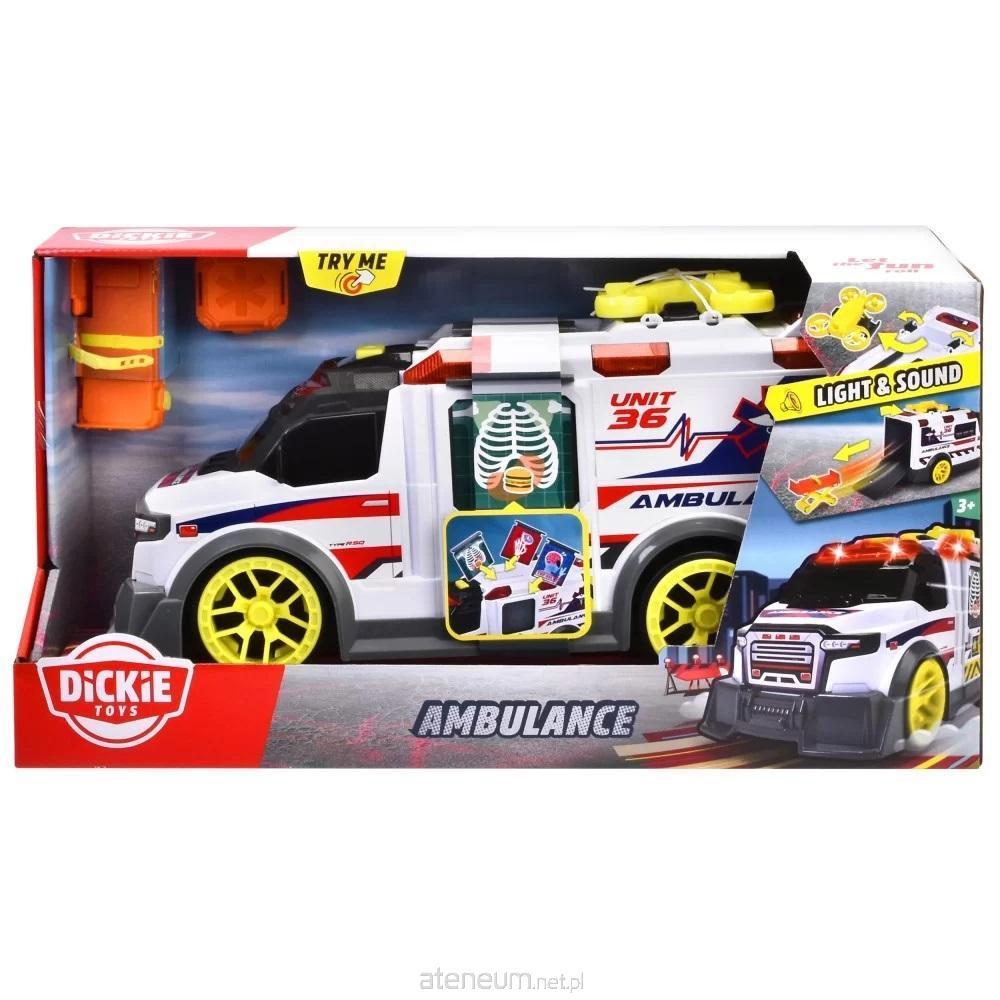 Duży ambulans ze światłem i dźwiękiem. Karetka z otwieranym bagażnikiem. W zestawie nosze, dron i apteczka.