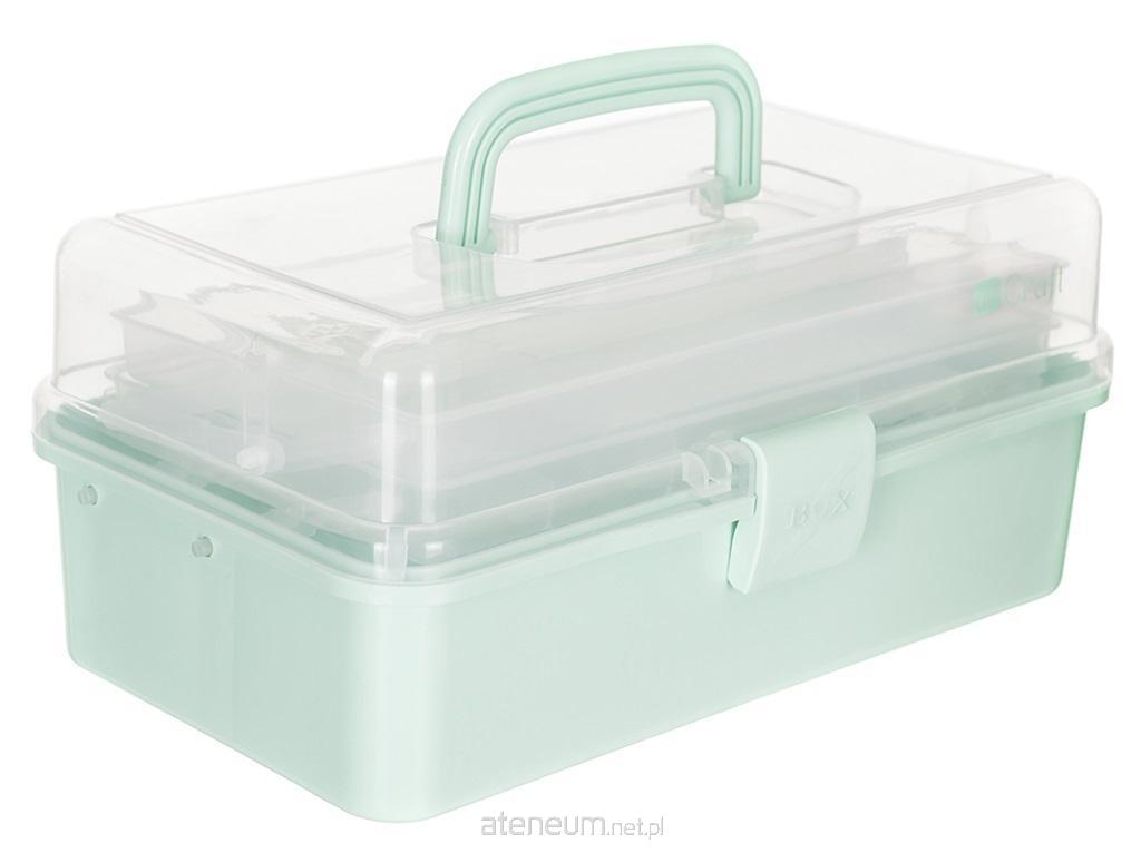 Plastikowy kuferek-organizer to must have każdego craftera! Idealny do przechowywania drobnych dodatków, ale też świetnie sprawdzi się jako pudełko na dziecięce skarby. Wieczko wykonane z przezroczystego plastiku, z rączką i zamknięciem w kolorze miętowym, podobnie jak dno pudełka.