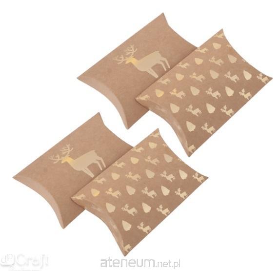 Pudełka składane typu pillow box z motywem złotych jelonków i choinek to doskonałe opakowania na świąteczne prezenty. Można schować do nich m.in. vouchery podarunkowe, biżuterię lub inne, drobne upominki. Te tekturowe pudełka nadają się także do dodatkowego zdobienia np. wstążeczkami, naklejkami lub drewnianymi elementami. Pudełeczka są do samodzielnego złożenia.