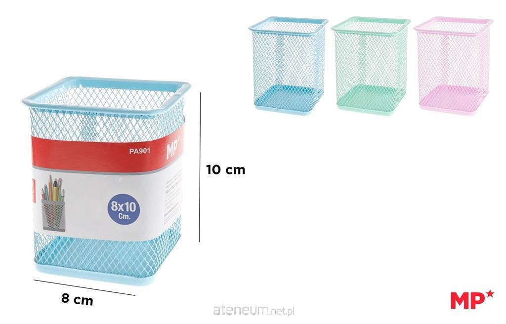 Stojak na długopisy wykonany z metalowej siatki. Kwadrat.Idealny na stół biurowy, do gabinetu lub stołu projektowego. Rozmiar: 10 cm wysokości x 8 cm szerokości. W trzech pastelowych kolorach: morskiej zieleni, jasnoniebieskim i różowym.