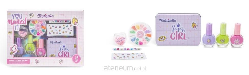Zestaw kosmetyków dla dzieci zawiera: 3 lakiery do paznokci, naklejki, koło z ozdobami do paznokci, blaszane pudełko.