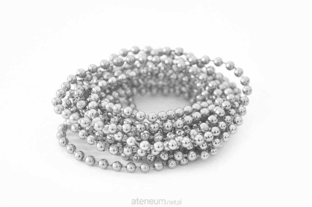 Łańcuch perełki - dekoracja choinkowa, długość ok. 270 cm. Średnica pojedynczej perełki ok. 6 mm. Kolor srebrny.