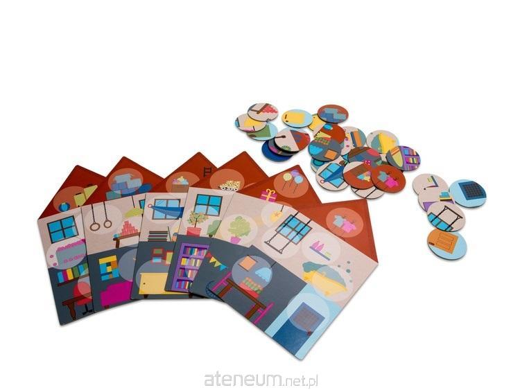 W zestawie znajdują się następujące elementy wykonane z grubego i trwałego kartonu: 6 dużych makiet z rysunkiem domku 25 x 14 cm, 36 żetonów z rysunkiem fragmentu domku (średnica 5cm)