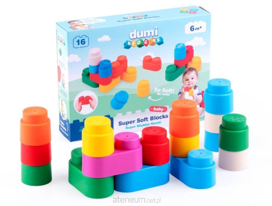 Baw się kreatywnie, dając upust swojej wyobraźni! Budowanie z klocków to twórcze zajęcie, na które nigdy nie jest za wcześnie. Mięciutkie klocki Dumi Blocks wykonane zostały z elastycznego tworzywa, a ich krawędzie są gładkie i bezpieczne dla maluszków. W zestawie znajduje się 16 klocków w losowo wybranych kolorach oraz w dwóch kształtach: 12 klocków pojedynczych i 4 klocki podwójne.